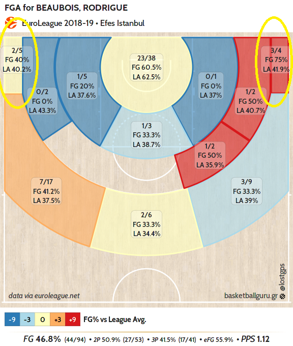 Μιλάμε φυσικά για εννέα (9) όλες κι όλες προσπάθειες. Μπορεί να σας φαίνονται λίγες, όμως πέρυσι όλη την σεζόν ο Μπομπουά είχε πάρει 12. Επίσης, ο Γιουλ έχει φέτος από αυτά τα σημεία ... μία. Λιγότερα corner threes από τον γκαρντ της Εφές έχουν επίσης οι Ντε Κολό, Σέρχι, Σπανούλης, Ντατόμε, Χίγκινς, βάλτε όποιο γκαρντ θέλετε. Ο Σβεντ έχει 7. Τα μεγάλα όπλα του scoring των υπολοίπων ομάδων, παίκτες που διαθέτουν όλο το πιθανό ρεπερτόριο κινήσεων, δεν πολυτοποθετούνται εκεί. Για να προκύψουν 9 προσπάθειες (που βασικά είναι περισσότερες, αν συμβουλευτείτε ένα hex map για τα ακριβώς διπλανά σουτ1), αυτό σημαίνει ότι ο παίκτης περνάει κάμποση από την ώρα του εκεί, πολύ συχνά απασχολώντας τον καλύτερο αμυντικό των αντιπάλων, καθότι πρόκειται για τον Μπομπουά, όχι για κάποιον χτίστη. Σε εικόνα παιχνιδιού, ιδού...