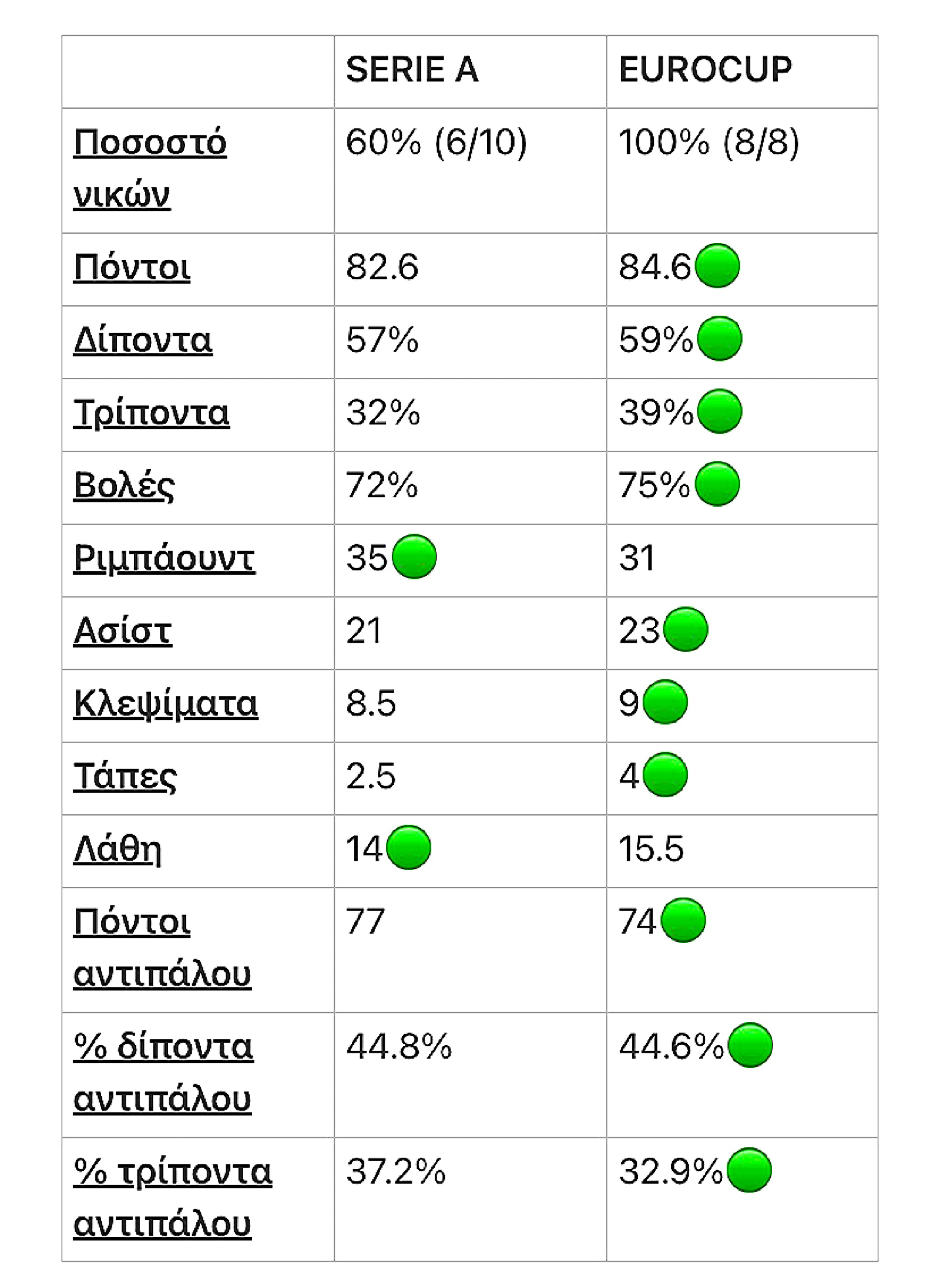 Σε σύγκριση με την Ευρώπη, η Βίρτους έχει χαμηλότερα ποσοστά ευστοχίας στην ιταλική λίγκα, ενώ επίσης είναι χειρότερη σε στατιστικές κατηγορίες όπως ασίστ, κλεψίματα, μπλοκ, πόντοι και ποσοστά που επιτρέπει στον αντίπαλο. Δείτε αναλυτικά.