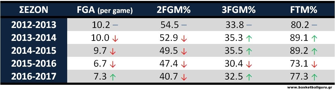 Τελικά, αυτό δε συνέβη ποτέ. Αφενός γιατί οι τραυματισμοί στην μέση είναι ύπουλοι κι επηρεάζουν σημαντικά τους αθλητές, αφετέρου διότι "ξεπετάχτηκε" ίσως περισσότερο από το αναμενόμενο ο Λούκα Ντόντσιτς, ο οποίος παρότι είναι μόνο 18 ετών, ήδη έχει πάρει επ' ώμου αρκετές σημαντικές αρμοδιότητες για την λειτουργία του ισπανικού υπερωκεάνιου. Ο Ρούντι έχει χάσει τη σβελτάδα του, είναι πιο σοφτ κι όχι τόσο φρέσκος. Το ντεπόζιτο αδειάζει. Όχι μόνο επειδή τα χρόνια περνάνε και πλέον βαδίζει στα 32, αλλά κι επειδή εμφανίζονται «κατάλοιπα» από τους συχνούς τραυματισμούς. Στον παρακάτω πίνακα βλέπουμε πως οι 10 προσπάθειες ανά αγώνα που κάποτε αποτελούσαν προσωπική του «ταρίφα», έχουν μετατραπεί σε ένα οικονομικότατο 7ρακι, ενώ τα ποσοστά ευστοχίας παρουσιάζουν επίσης πτώση. Μπορούμε να διχοτομήσουμε την πενταετία του ως εξής: οι πρώτες τρεις σεζόν συνοψίζονται ως οι… glory days του Ρούντι - με ισάριθμα Final Four κι αποκορύφωμα την κατάκτηση της EL το 2015 - κι οι επόμενες δύο ως η έναρξη της απομυθοποίησης. Για ρίξτε μια ματιά.