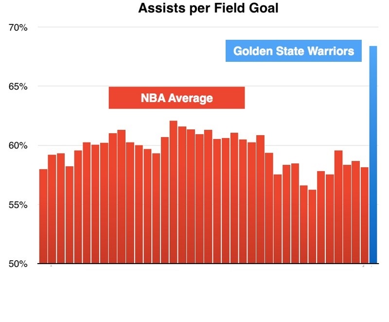 Επιπλέον, ο μόνος τομέας στον οποίo δεν βρίσκονται στην κορυφή, είναι αυτός των assisted τριπόντων. Η εξήγηση είναι απλή: υπάρχει πάντα η πιθανότητα ένας εκ των Curry/Thompson/Durant να σηκωθούν και να ευστοχήσουν για τρεις από οποιοδήποτε σημείο του γηπέδου. Αποτέλεσμα όλων αυτών είναι φυσικά το υψηλότερο offensive rating (113,5) στην ιστορία του αθλήματος και η περσινή παρέλαση μέχρι τον τίτλο του πρωταθλητή.