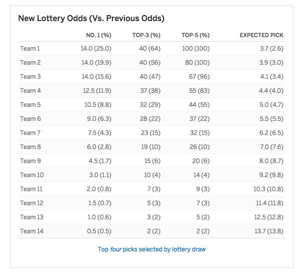 Στον παρακάτω πίνακα που δημοσίευσε το ESPN, απεικονίζονται αναλυτικά οι αλλαγές στην λοταρία του ΝΒΑ, που θα τεθούν σε εφαρμογή για πρώτη φορά το 2019 (σε παρένθεση είναι αυτά που ισχύουν μέχρι τώρα). Προσπαθώντας να τις αναλύσουμε, μπορούμε να τις χωρίσουμε χοντρικά σε δυο κατηγορίες.